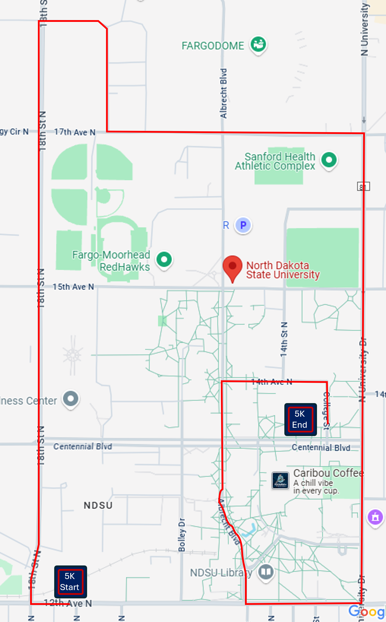 The race begins in the 12th Street parking lot, then heads north on 18th Street, loops around Research Drive, and continues along 17th Street before turning onto the scenic stretch of University Drive. From there, runners proceed south on 12th Street and reenter the NDSU campus, finishing adjacent to the historic Bunker Building. Along the way, participants will pass several iconic Fargo landmarks, including University Drive, 18th Street, and Albrecht Boulevard.